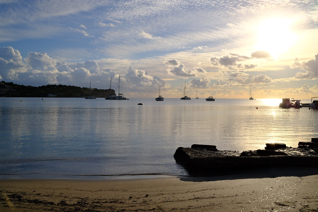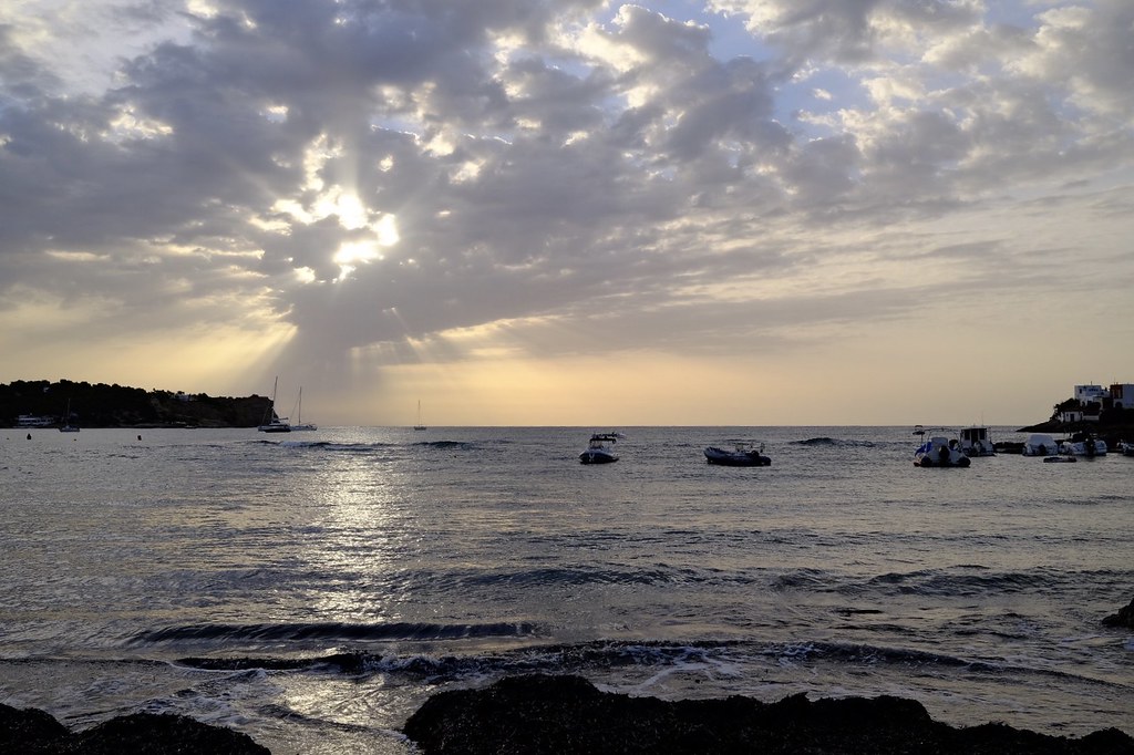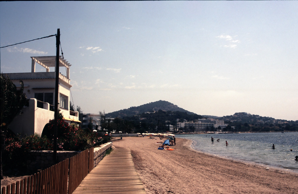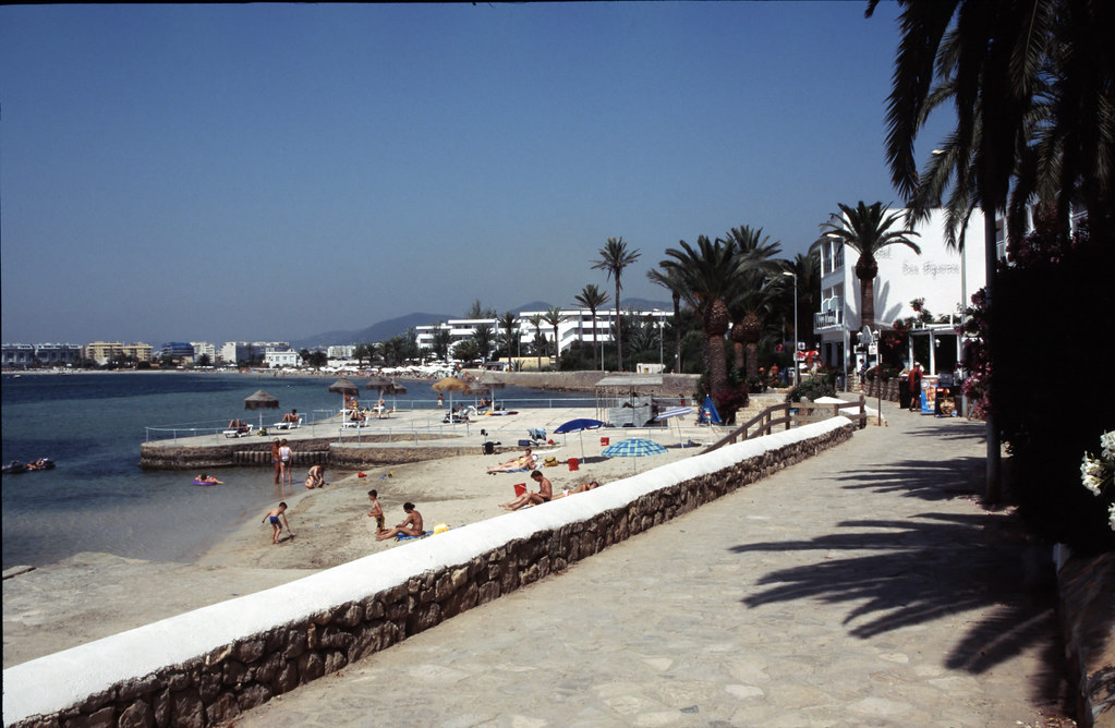 This beach is located in the Ibiza town, south of the island. It's a small beach, but it has everything you need – sun loungers, parasols, a few restaurants and bars, and crystal-clear water for swimming. The sand is white, and the surroundings are beautiful, with cliffs and trees providing natural shade.
